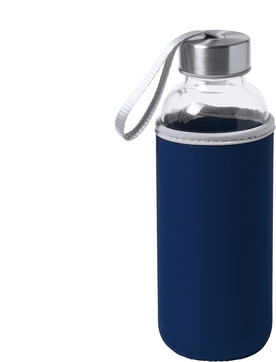 Skleněná láhev s popruhem na uzávěru a barevným neoprenovým krytem. 420 ml. Nevhodné pro sycené nápoje.