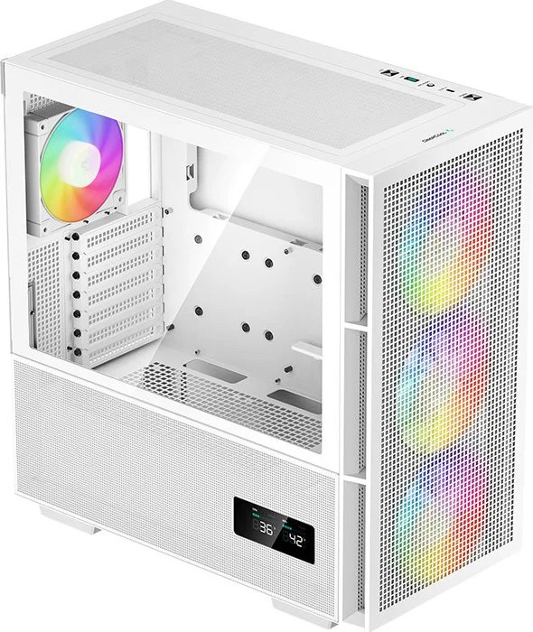 DEEPCOOL CH560 DIGITALSkříň formátu Middle Tower s průhlednou bočnicí nabízí dvě 2,5" pozice pro SSD disky a dvě 3,5" pozice pro pevné disky. Na horním panelu se nachází jeden port USB 3.0, jeden port USB-C a kombinovaný port sluchátek a mikrofonu. Skříň je vybavena jedním 120 mm ventilátorem na zadní straně a třemi 140 mm ventilátory na přední straně. Všechny dodávané ventilátory navíc disponují ARGB podsvícením. Důmyslné řešení umožňuje pohodlné umístění až 360 mm dlouhého výměníku vodního chlazení na přední či horní straně. Ve skříni je dostatek prostoru pro chladič CPU do výšky až 175 mm a grafickou kartu o délce 380 mm. Zajisté potěší také digitální displej na boční straně, který umožňuje sledovat informace o kritických teplotách CPU nebo GPU. Skříň je dodávána bez zdroje.ZÁKLADNÍ SPECIFIKACEProvedení skříně: Middle TowerInterní pozice: 2× 2,5", 2× 3,5"Kompatibilita základní desky: E-ATX, ATX, Micro ATX, Mini-ITXZdroj: bez zdrojeKonektory na horním panelu: 1× USB 3.0, 1× USB-C, 1× kombinovaný port sluchátek a mikrofonuRozměry: 471 × 458 × 230 mmBarva: bílá