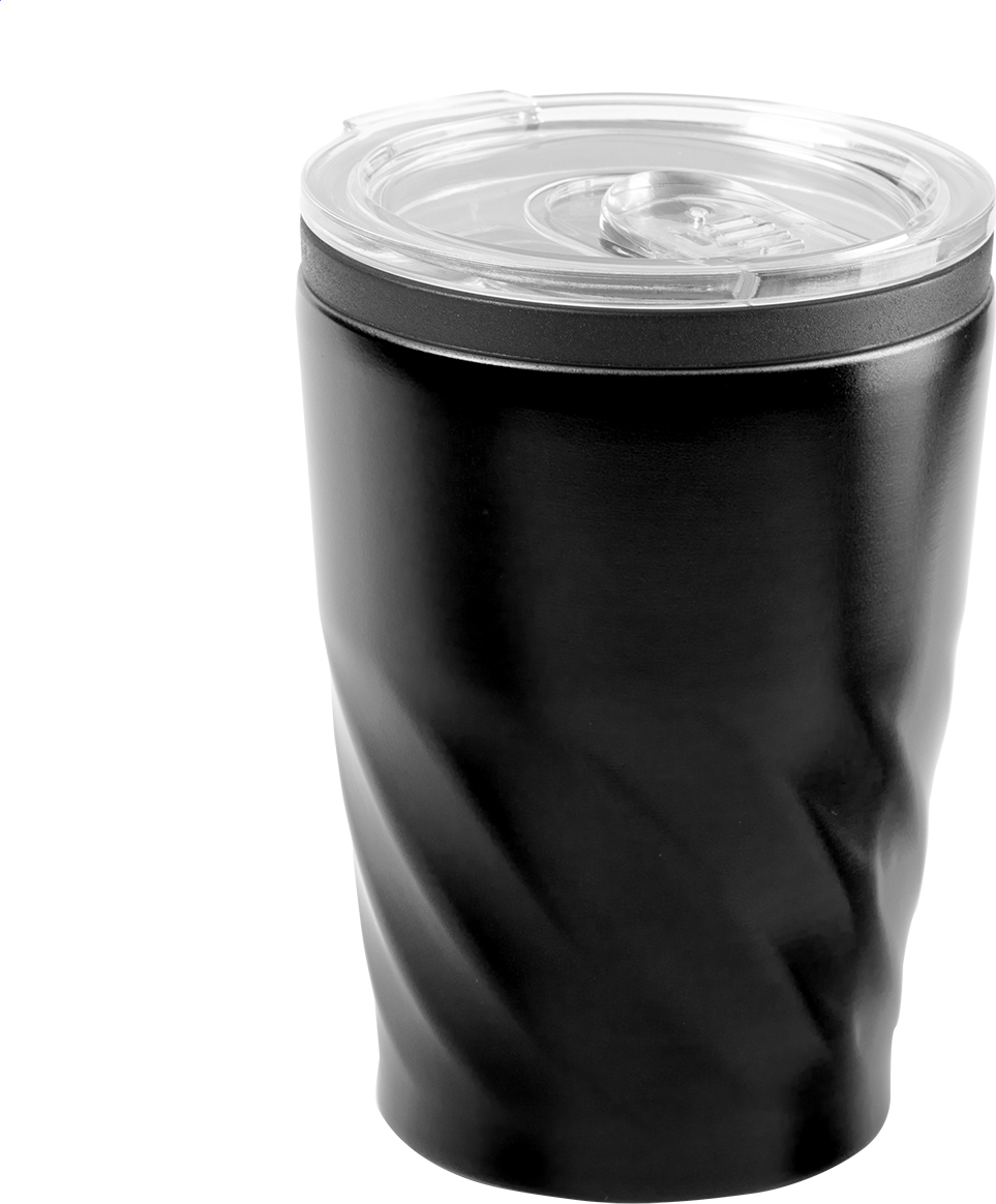 Nerezový, jednostěnný termo hrnek s plastovým víčkem na pití, 350 ml.