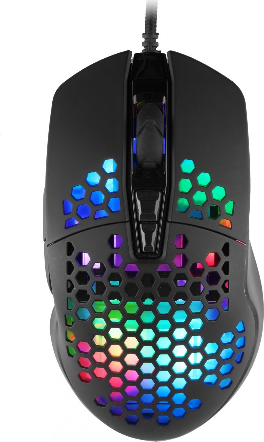 Herní myš C-TECH Scarab Vás na první pohled okouzlí svým elegantním tvarem a RGB podsvětlením. Myš disponuje optickým snímačem Instant 725F s maximálním rozlišením 7200DPI, které je možno pomocí tlačítka DPI měnit v 6 úrovních. Každá úroveň je při přepnutí signalizována 1s barevnou indikací. Myš je vybavena 5 tlačítky, které vám poskytnou dokonalou kontrolu nad hrou. Další dvě tlačítka jsou pro změnu DPI a volbu RGB režimu podsvětlení. 4 RGB módy s 16.8 miliony barev oživí váš stůl nejen při hraní her, ale i při kancelářské práci. Pohodlný úchop zajišťuje pogumovaný povrch horní části. Myš C-tech Scarab je díky své ergonomii vhodná pro praváky a k počítači ji připojíte 1,5m opleteným kabelem s USB konektorem.Specifikace :Snímač: optický Instant 725FRozlišení: 1200-1600-2400-3200-4800-7200DPIBarevná indikace DPI : žlutá-modrá-fialová-zelená-červená-světle modráPočet tlačítek: 7Spínač : Hauno, životnost 4mil. sepnutíRGB podsvícení : 12 módů + vypnutí podsvětleníPřipojení : USB 2.0Kabel: opletený se stíněním 1.5mRozměry : 123x67x40mmVáha : 75gKompatibilní s Win 7/8/10/XP/VISTA