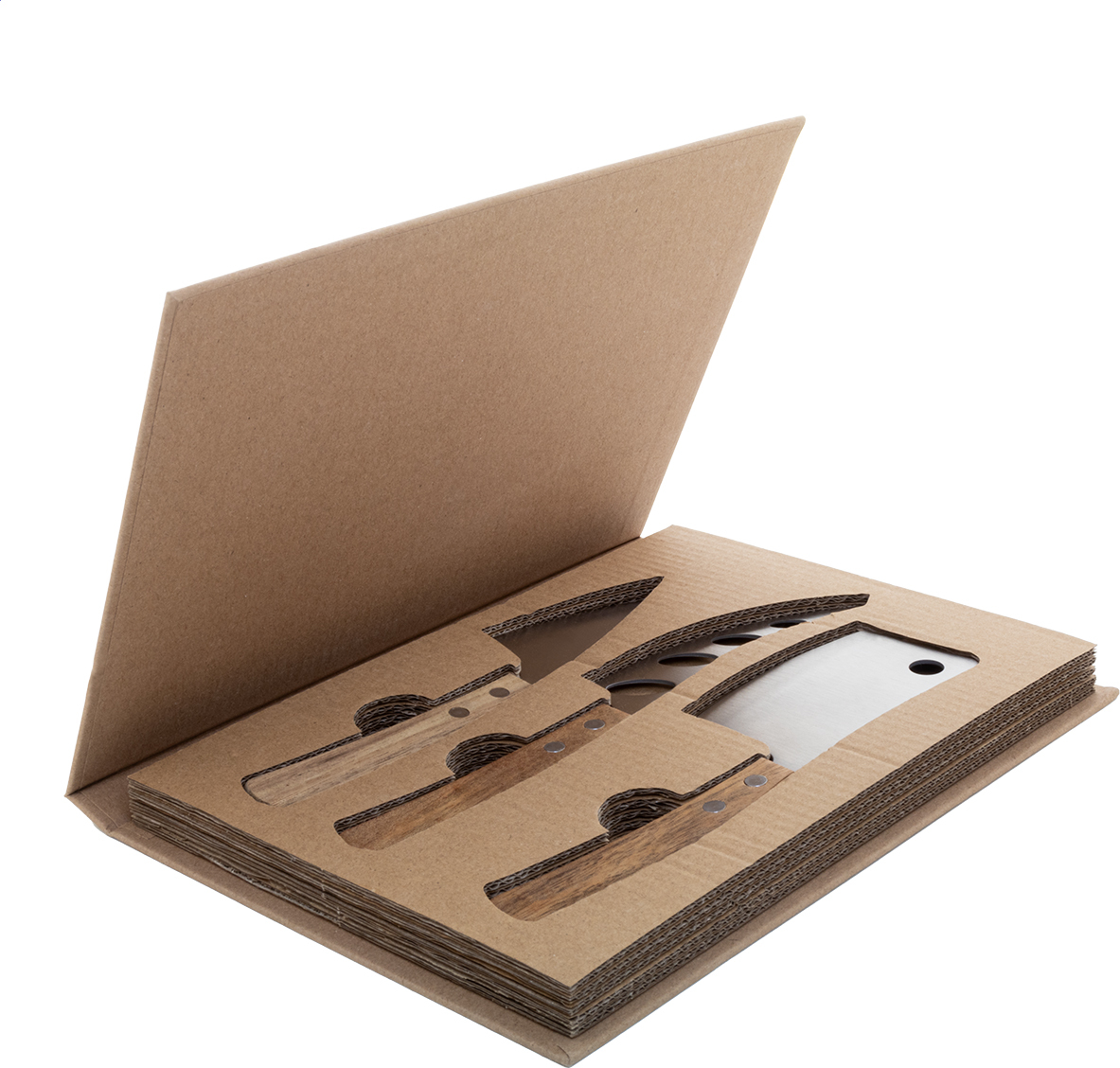 3dílná sada nožů na sýr z nerezové oceli s rukojetí z akáciového dřeva. V krabičce ve tvaru knihy z kraftového papíru.