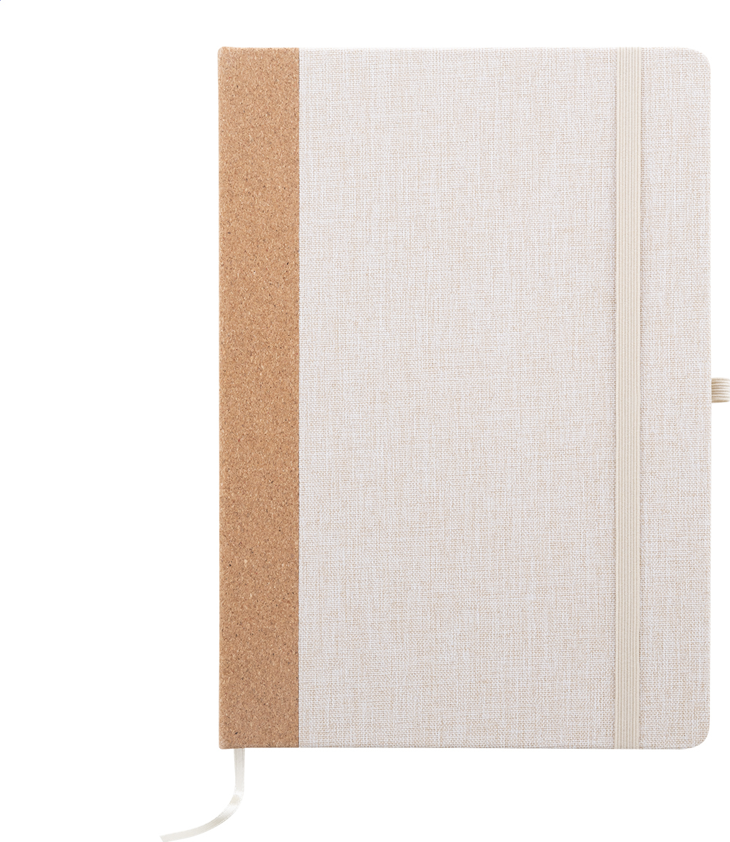 Blok A5 potažený polyesterem RPET s hřbetem z přírodního korku a 80 linkovanými listy z recyklovaného papíru. Se záložkou, gumovým páskem a držákem na pero.