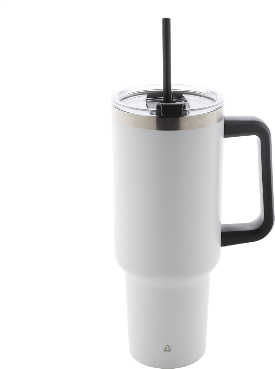 Dvouplášťový vakuově izolovaný termo hrnek z recyklované nerezové oceli s PS víčkem na pití a PP brčkem. 1200 ml.