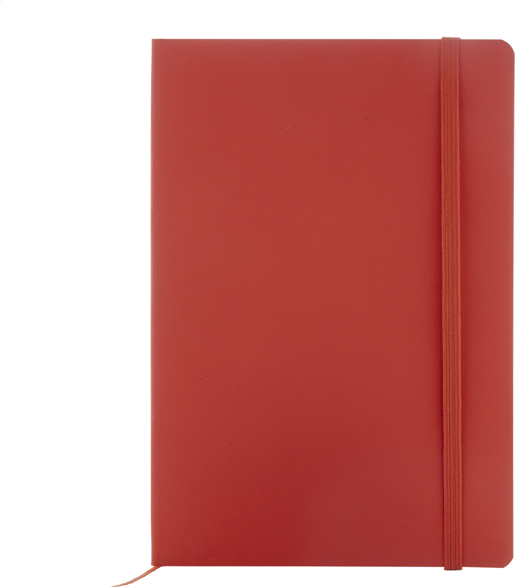 Blok A5 z recyklované PU kůže s měkkou vazbou s 80 linkovanými listy z recyklovaného papíru. Se záložkou v odpovídající barvě a gumičkou.