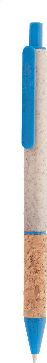 Ekologické plastové kuličkové pero z pšeničné slámy s přírodním korkem a barevnými částmi. S modrou náplní.
