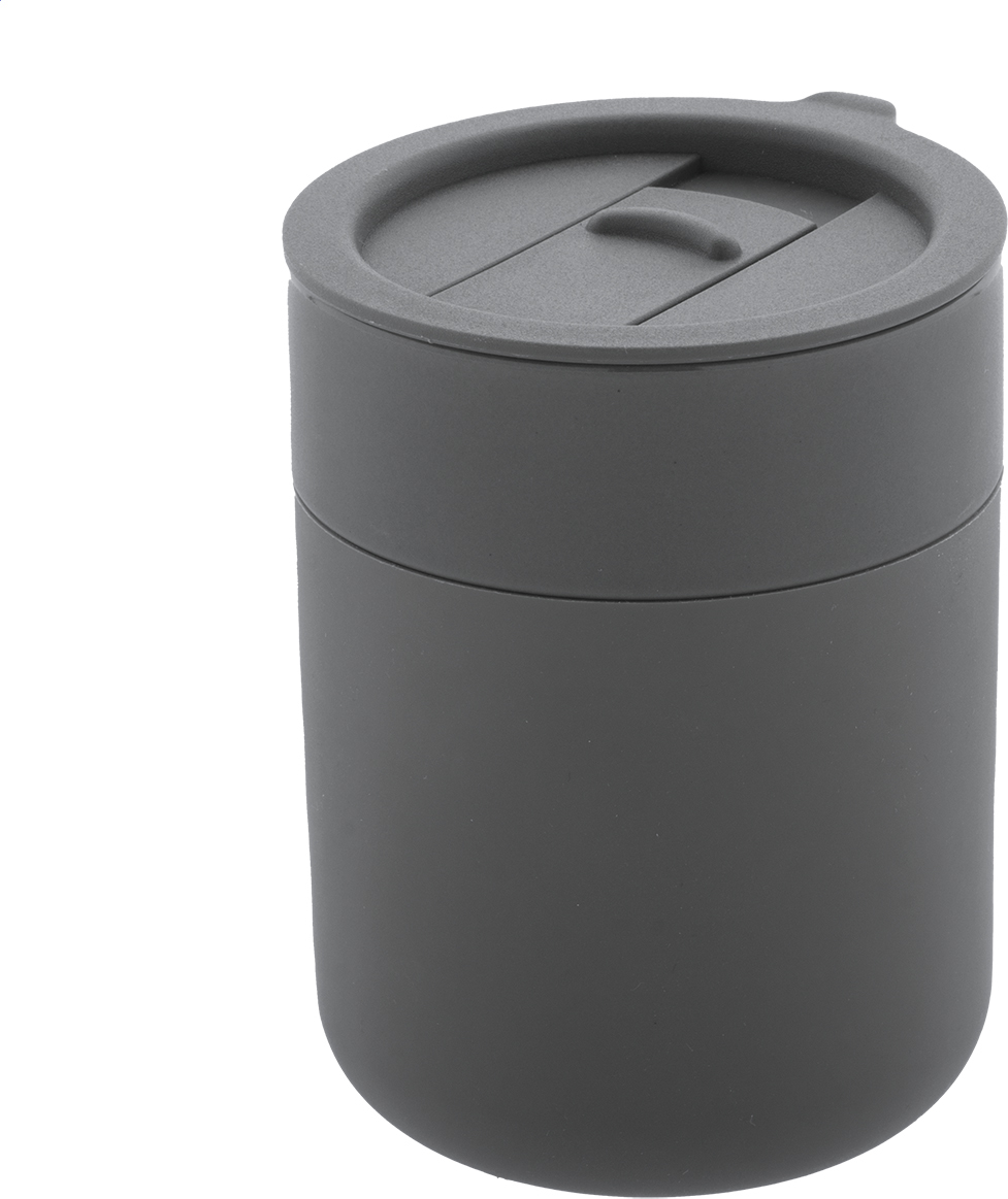 Silikonem potažený keramický cestovní kelímek s PP plastovým odkapávacím víčkem. 300 ml.