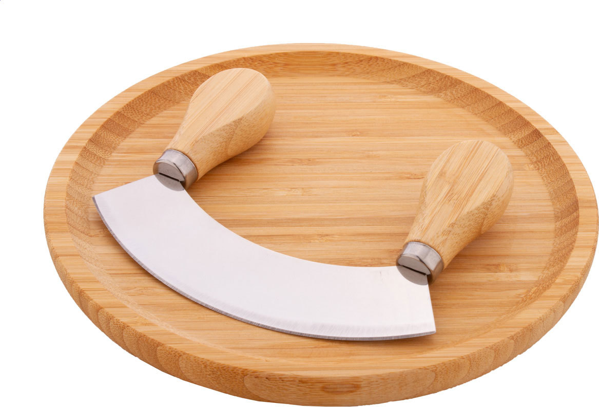 Sada z bambusu na krájení bylin, včetně kulatého bambusového prkénka a nerezového kráječe na bylinky s bambusovými rukojeťmi.