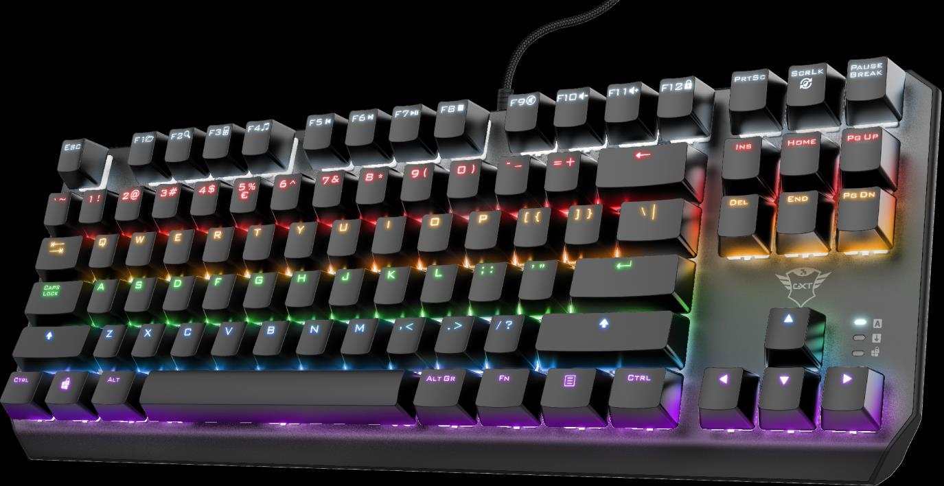 Kompaktní herní klávesnice bez numerického bloku s mechanickými spínači a duhovým podsvícením • Rychlé a citlivé mechanické spínače Outemu s životností až 50 milionů stisknutí kláves• Design bez numerického bloku; zabírá méně místa na stole• Díky technologii N-key rollover se stisknutí každého tlačítka projeví ve vaší hře• Podsvícení v podobě duhových vln; 6 barev s 20 režimy a nastavitelným jasem a rychlostí• 11 funkčních kláves; multimediální a herní/kancelářské funkce budete mít pod kontrolou• Kovová horní deska pro robustní herní zážitek
